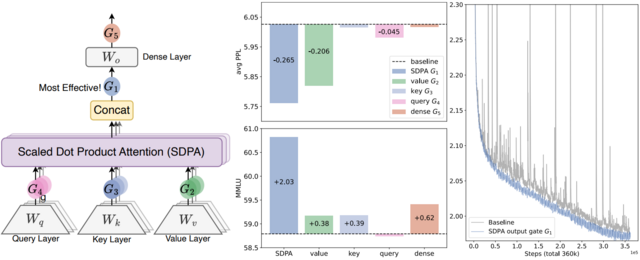 - Gated Attention for Large Language Models: Non-linearity, Sparsity, and Attention-Sink-Free (https://arxiv.org/pdf/2505.06708). The authors introduce Gated Attention, a simple architectural refinement that inserts a learnable, input-dependent sigmoid gate directly after the output of Scaled Dot-Product Attention, introducing query-dependent sparsity and crucial non-linearity between the value and final output projections. This minimal change suppresses redundant attention contributions, eliminates training instabilities like loss spikes, and consistently improves perplexity and downstream performance across both 15B MoE and 1.7B dense models trained on massive datasets. Notably, it directly addresses the root causes of the attention sink and massive activations through learned, input-sensitive sparsity—eliminating the need for manual workarounds like special sink tokens or ad hoc normalization tricks. As a result, the model exhibits far better long-context extrapolation, maintaining performance even when context lengths are extended beyond the training range. The reduction in extreme activation values and the elimination of disproportionate attention to early tokens suggest that this approach will make models more amenable to compression techniques such as quantization and token pruning, by creating a more uniform, sparse, and predictable activation profile. The code: https://github.com/qiuzh20/gated_attention