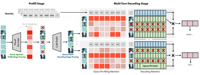 - SparseVILA: Decoupling Visual Sparsity for Efficient VLM Inference (https://arxiv.org/pdf/2510.17777). SparseVILA addresses the scalability limitations of Vision Language Models (VLMs) caused by the high computational cost of processing extensive visual tokens in long-context tasks. The framework introduces a decoupled sparsity paradigm that applies distinct optimization strategies to the prefill and decoding stages of inference. During the prefill phase, the model employs query-agnostic pruning to remove redundant visual data based on salience, efficiently creating a compact shared context. In contrast, the decoding phase utilizes query-aware retrieval to dynamically select only the specific visual tokens relevant to the current text query from the cache. This design preserves the integrity of multi-turn conversations by retaining a comprehensive visual cache, allowing different tokens to be retrieved for subsequent questions without permanent information loss. Experimental results demonstrate that SparseVILA achieves up to 2.6x end-to-end speedups on long-context video tasks while maintaining or improving accuracy across various image and reasoning benchmarks.