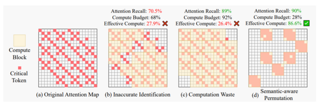 - Semantic-aware permutation: k-means clustering is applied to the Q/K/V vectors of each head and layer, and tokens are permuted by cluster to form semantically coherent blocks, improving the accuracy of critical-token detection.
