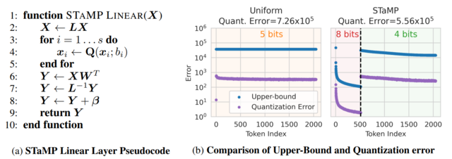 - STaMP: Sequence Transformation and Mixed Precision for Low-Precision Activation Quantization (https://arxiv.org/abs/2510.26771). STaMP is a post-training quantization technique designed to enhance the accuracy of low-bit activation quantization in large generative models by exploiting correlations along the sequence dimension rather than just the feature dimension. It combines invertible linear transformations—such as the Discrete Wavelet Transform (DWT) or Discrete Cosine Transform (DCT)—with mixed-precision quantization to concentrate the majority of activation energy into a small subset of tokens. These high-energy tokens are preserved at higher bit depths (e.g., 8-bit), while the remaining tokens are quantized to lower precision (e.g., 4-bit). The approach reduces quantization error more effectively than uniform bit allocation, especially under aggressive 4-bit constraints, and works synergistically with existing methods like SmoothQuant or QuaRot that operate on feature axes. Crucially, because the sequence transformation is orthogonal and linear, its inverse can often be merged with downstream operations such as bias addition or matrix multiplication, resulting in negligible additional computational cost during inference. The method requires no retraining and has been shown to improve both language and vision models consistently across benchmarks.