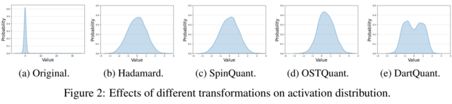 - DartQuant: Efficient Rotational Distribution Calibration for LLM Quantization(https://arxiv.org/pdf/2511.04063). DartQuant introduces an efficient method for quantizing large language models (LLMs). Instead of relying on computationally expensive end-to-end fine-tuning of rotation matrices—as done in methods like SpinQuant and OSTQuant—DartQuant eliminates the need for task-specific losses and instead optimizes activation distributions to be more uniform, using a novel loss function called Whip loss. This approach reduces the impact of extreme outliers in activations, which are a major source of quantization error, by reshaping the distribution from a Laplacian-like form toward a uniform one within a bounded range. To further reduce overhead, DartQuant proposes QR-Orth, an optimization scheme that leverages QR decomposition to enforce orthogonality on rotation matrices without requiring complex manifold optimizers like Cayley SGD. This cuts the computational cost of rotation calibration by 47× and memory usage by 10× on a 70B model, enabling full rotational calibration on a single consumer-grade RTX 3090 GPU in under 3 hours. The method maintains or slightly improves upon state-of-the-art quantization accuracy across multiple LLMs (Llama-2, Llama-3, Mixtral, DeepSeek-MoE) and evaluation benchmarks, including zero-shot reasoning tasks and perplexity metrics, while being robust to different calibration datasets and sample sizes. The code: https://github.com/CAS-CLab/DartQuant