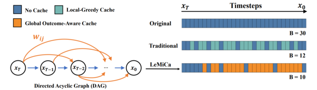 - LeMiCa: Lexicographic Minimax Path Caching for Efficient Diffusion-Based Video Generation (https://arxiv.org/pdf/2511.00090). LeMiCa is a novel, training-free, and efficient acceleration framework for diffusion-based video generation. The key idea is to take a global view of caching error using a Global Outcome-Aware error metric, which measures the impact of each cache segment on the final output. This approach removes temporal heterogeneity and mitigates error propagation. Using this metric, LeMiCa builds a Directed Acyclic Graph (DAG) in which each edge represents a potential cache segment, weighted by its global impact on output quality. The DAG is generated offline using multiple prompts and full sampling trajectories. LeMiCa then applies lexicographic minimax optimization to choose the path that minimizes worst-case degradation. Among all feasible paths under a fixed computational budget, it selects the one with the smallest maximum error. LeMiCa-slow achieves the highest reconstruction quality, reducing LPIPS from 0.134 → 0.05 on Open-Sora and 0.195 → 0.091 on Latte—over 2× improvement compared to TeaCache-slow. LeMiCa-fast improves inference speed from 2.60× → 2.93× on Latte relative to TeaCache-fast, while preserving visual quality. Unlike prior work that relies on online greedy strategies, LeMiCa precomputes its caching policy, eliminating runtime overhead. Code: https://unicomai.github.io/LeMiCa.